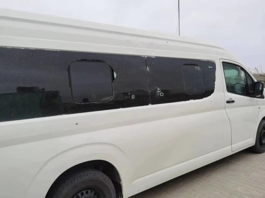 现场图片显示,中方车辆受到枪击。