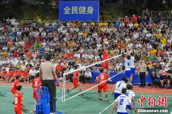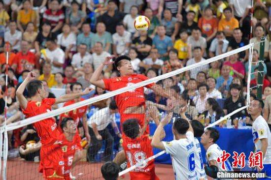 中新网记者 骆云飞 摄 图为海南“村VA”决赛之夜比赛现场,文昌东阁队(红衣)球员跃身扣杀进攻。