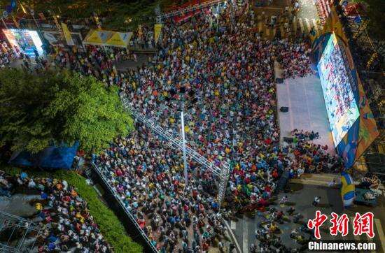 中新网记者 骆云飞 摄 图为海南“村VA”球场外的大屏幕前,聚集了众多观看比赛的民众。(无人机照片)