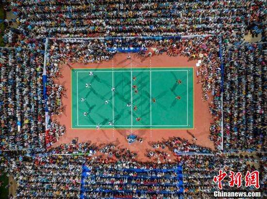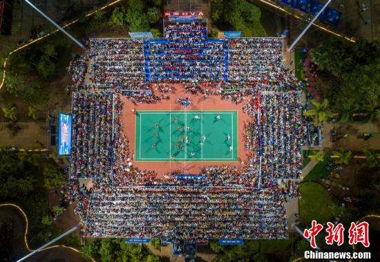 中新网记者 骆云飞 摄 图为海南“村VA”决赛之夜吸引众多民众前来观赏,球场内座无虚席。(无人机照片)