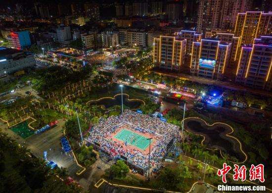 8月13日晚,2023年“九九杯”海南(文昌)乡镇排球联赛在“中国排球之乡”海南省文昌市文城镇玉阳公园落幕,东郊队3:2险胜东阁队摘取冠军。这个被称为海南版的“村VA”赛事自6月30日开赛以来,20支参赛队伍共进行了52场精彩比赛。每一场比赛看台上座无虚席,呐喊声此起彼伏。据文昌官方统计,该赛事共吸引观赛人流超过48万人次。图为海南“村VA”决赛之夜吸引众多民众前来观赏,球场内座无虚席。(无人机照片)