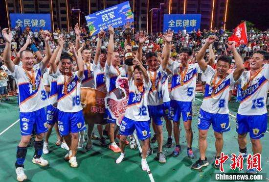 中新网记者 骆云飞 摄 图为文昌东郊队夺冠后球员举起奖杯庆祝。