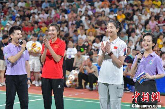 中新网记者 骆云飞 摄 图为中国女排前队长、里约奥运会冠军魏秋月(右二),前女排国手、亚运会冠军李颖(左二)亮相海南“村VA”决赛之夜。