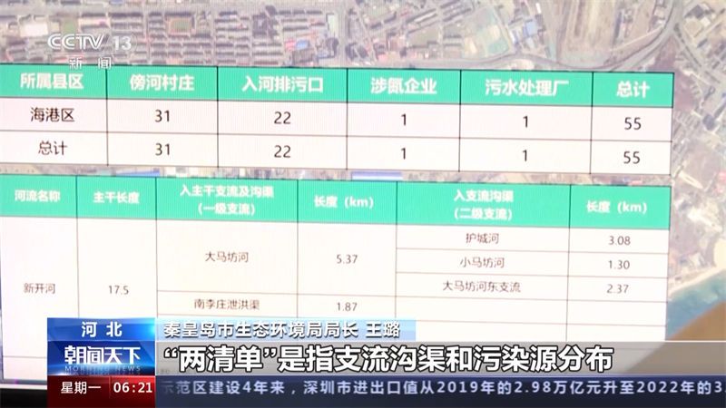 河北省秦皇岛市生态环境局局长 王璐:这就是我们的“一图两清单”,“一图”是指河流水系和污染分布,“两清单”是指支流沟渠和污染源分布。它覆盖了全市13条主要入海河流,以及333个入河排污口和1936个畜禽养殖户,我们根据降雨情况,对症下药,雨前摸排,雨中确保,雨后整改。