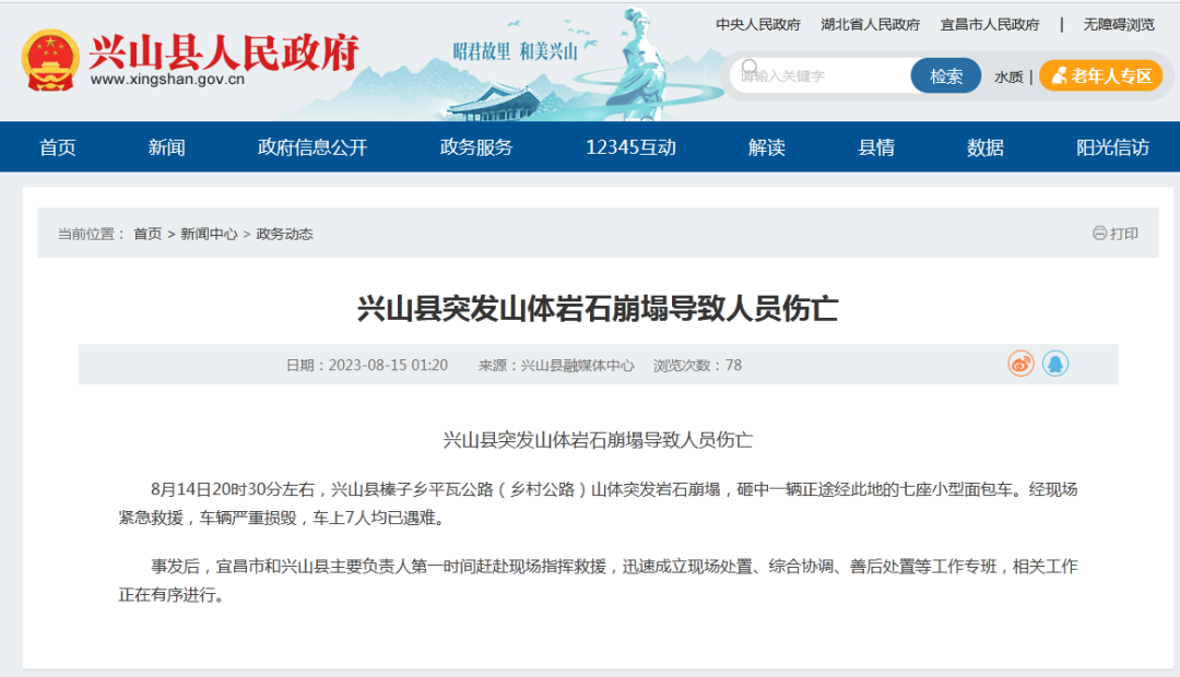 据湖北省兴山县人民政府网站消息,兴山县突发山体岩石崩塌导致人员伤亡。
