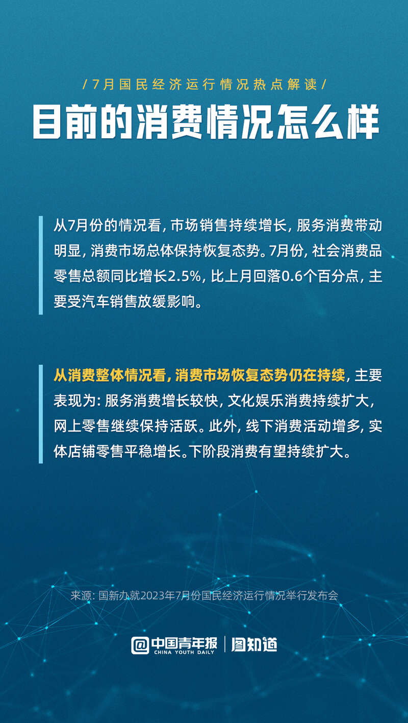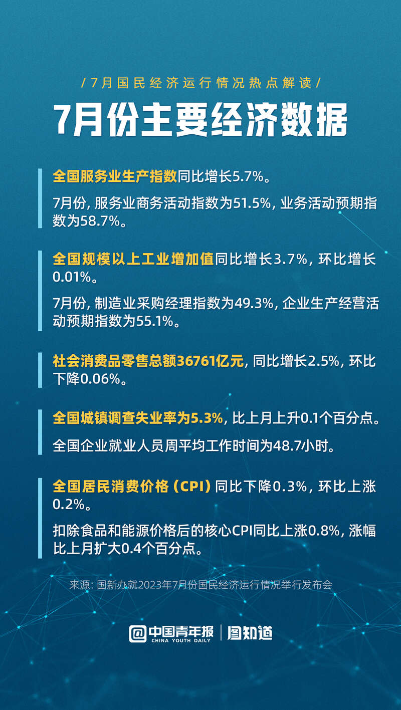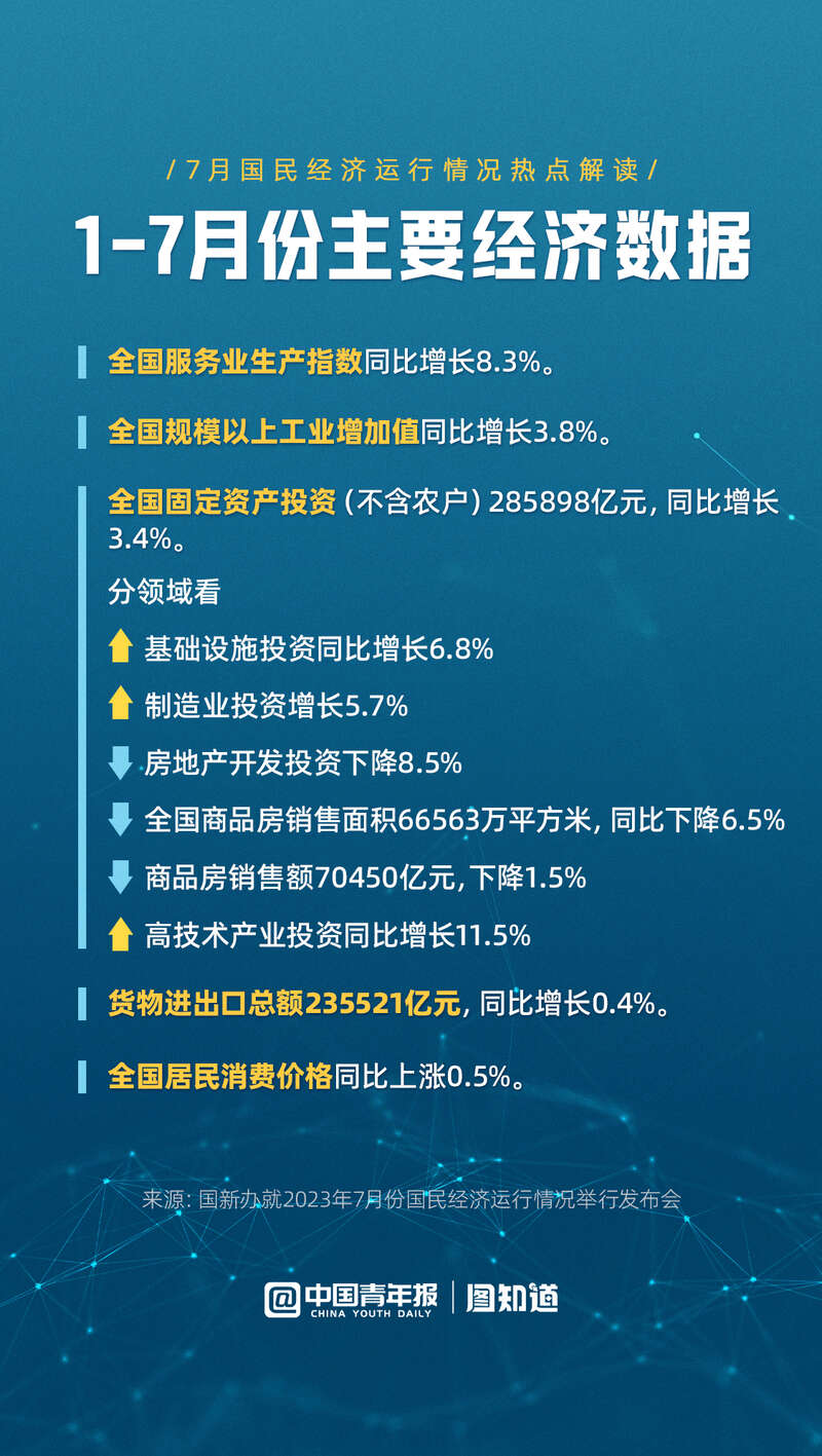 8月15日,国新办就2023年7月国民经济运行情况举行发布会。国家统计局新闻发言人、国民经济综合统计司司长付凌晖对近期经济指标进行解读,回应就业、房地产等热点话题。读图了解我国当前经济形势。