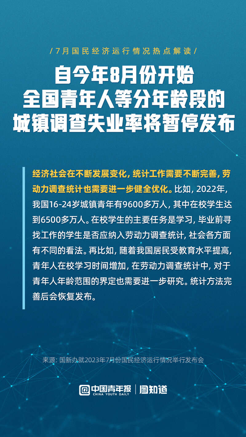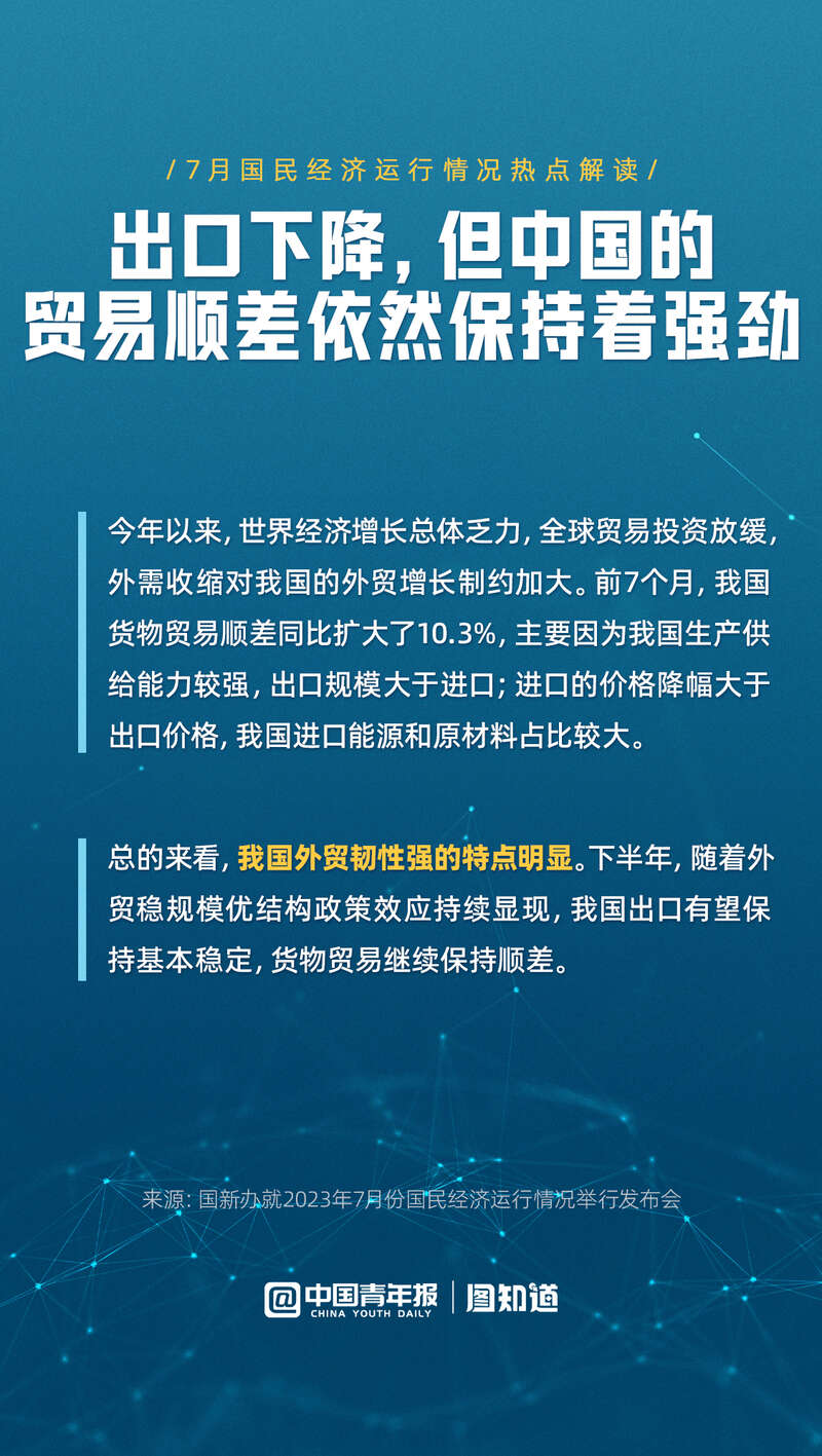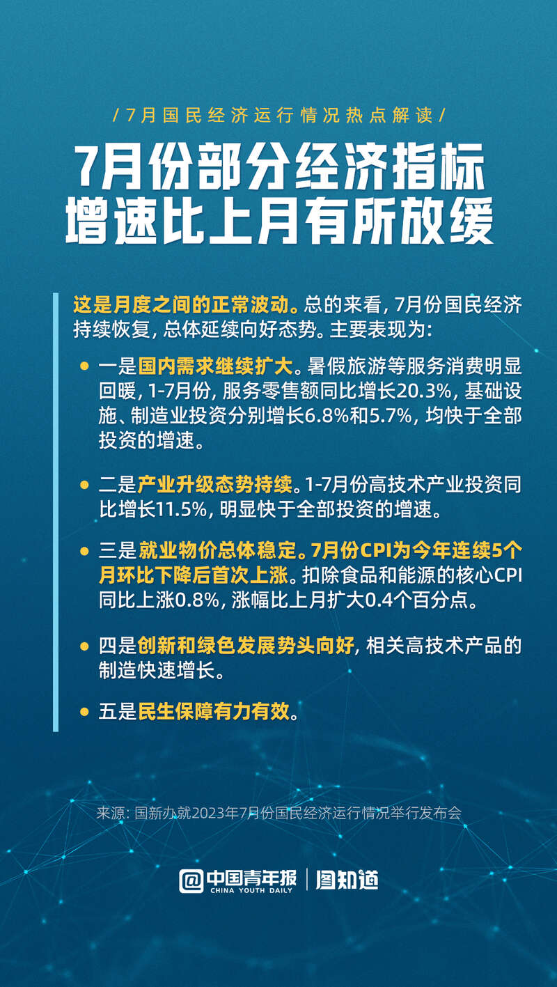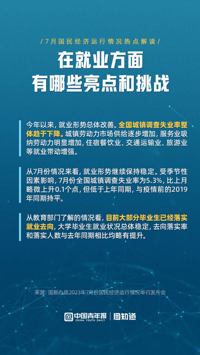 8月15日,国新办就2023年7月国民经济运行情况举行发布会。国家统计局新闻发言人、国民经济综合统计司司长付凌晖对近期经济指标进行解读,回应就业、房地产等热点话题。读图了解我国当前经济形势。