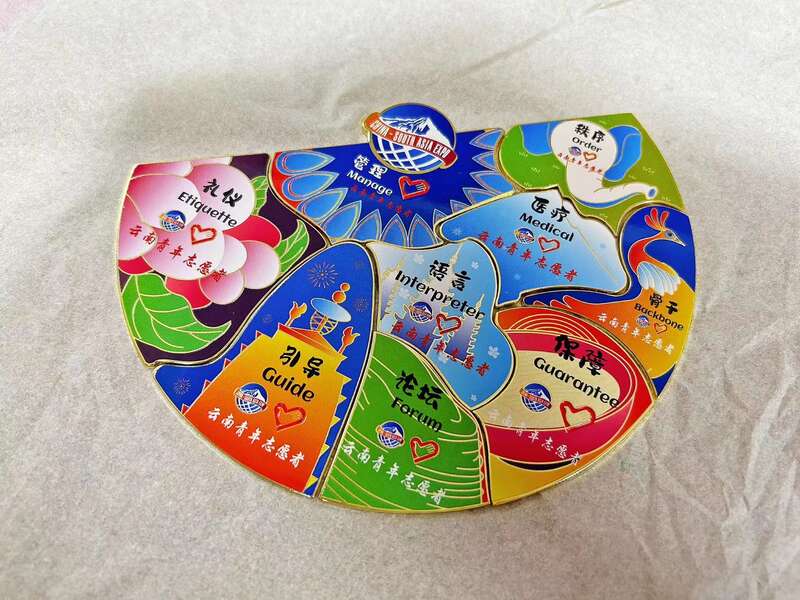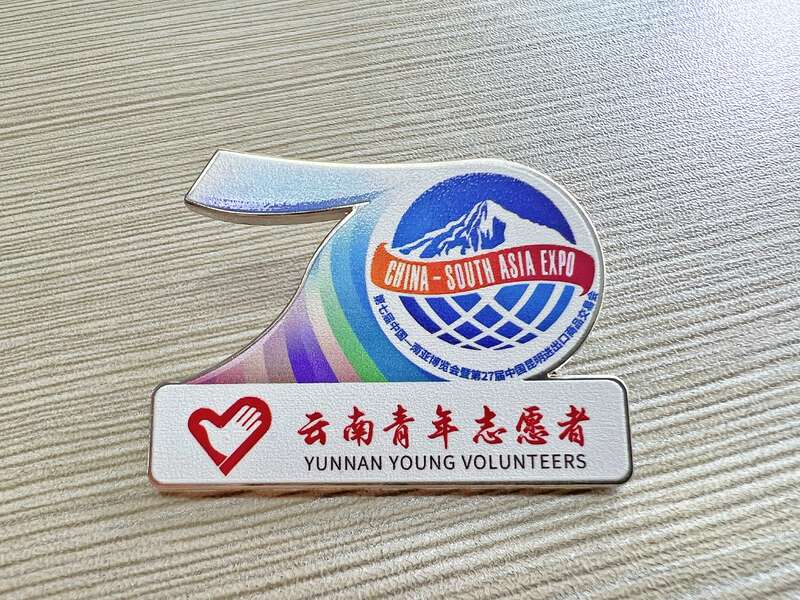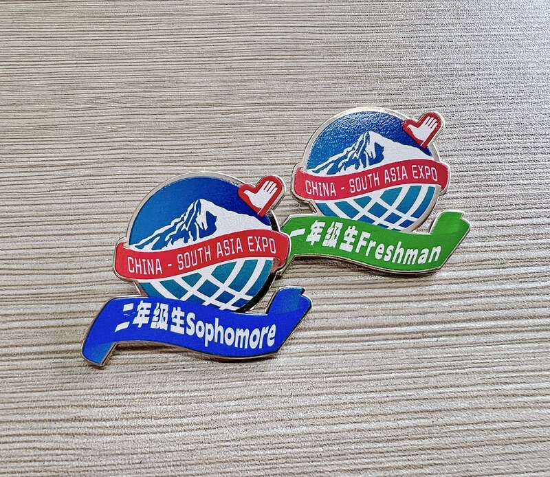 本届南博会首次创制设计了年级生徽章和岗位徽章两款志愿者徽章。年级徽章上有一至四年级标识与志愿者爱心融合,代表着志愿者参与南博会的年限,寓意着南博会志愿精神的传承和延续。岗位徽章由代表了骨干、语言、指引、论坛、秩序、礼仪、医疗和保障共8种岗位的8枚徽章组成,可拼成滇池国际会展中心孔雀开屏的完整图标,寓意着800名志愿者汇聚志愿力量,热情助力南博盛会。