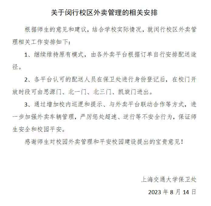 通知显示,即日(8月3日)起,原外卖平台向保卫处备案过的外卖配送员,可从东川路600号(“凯旋门”)入校完成配送,未经平台报备的外卖配送员禁止进校配送,只需将交大外卖订单送至就近中转站即可。9月1日起,所有外卖配送员禁止入校,校园外卖专送团队承接所有校园外卖订单。