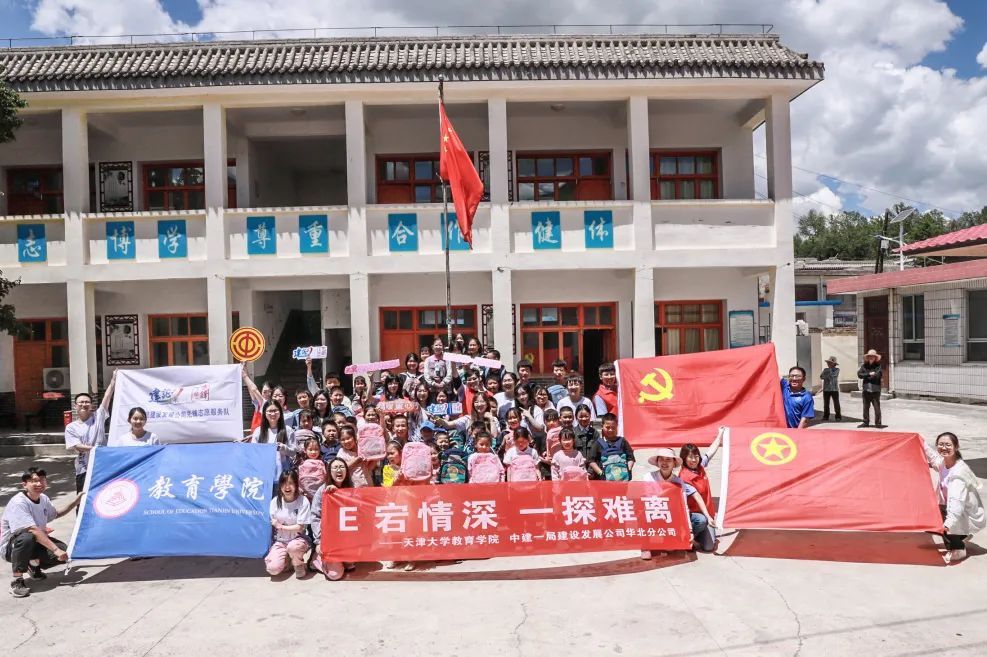 先锋志愿服务队与天津大学师生在磑子坝小学。中建一局供图