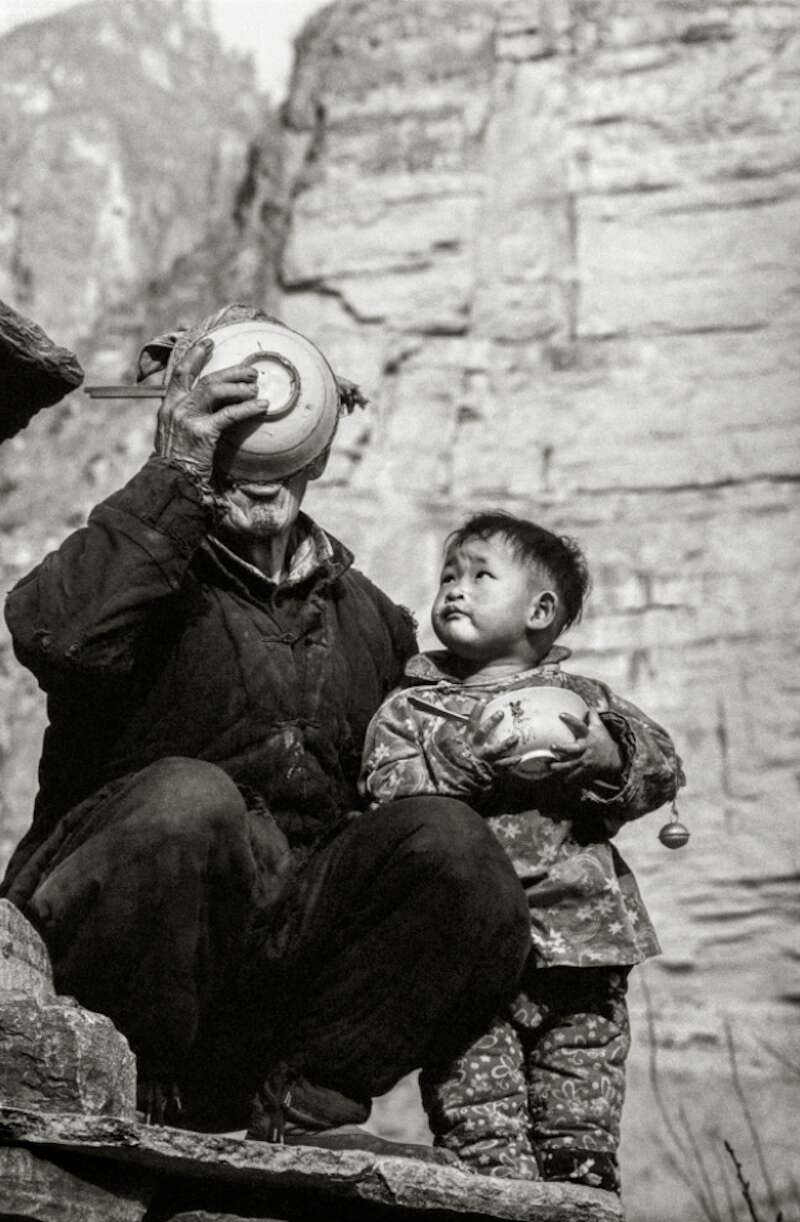《黄河百姓》被誉为“迄今为止以影像方式全面表现‘黄河人’生存状态的、时间跨度最大的摄影专著。” 《民以食为天》拍摄于1980年,是上世纪80年代黄河岸边最具有典型意义的生活常态,此时这对爷孙正蹲在石阶上吃饭,老人正在用满是皱纹老茧的手端着饭碗,大号瓷碗遮住了老人的整个面部。容器对表情的取代正是这幅作品的绝妙之处。老人的碗、孩子的眼,一下子抓住了人们的视线。情感、经验、观念与瞬间情景结合。