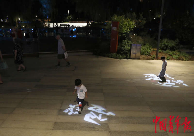 8月15日,北京市朝阳区亮马河边,两位小朋友好奇地在地上的激光投影中玩耍。中青报·中青网记者 陈剑/摄