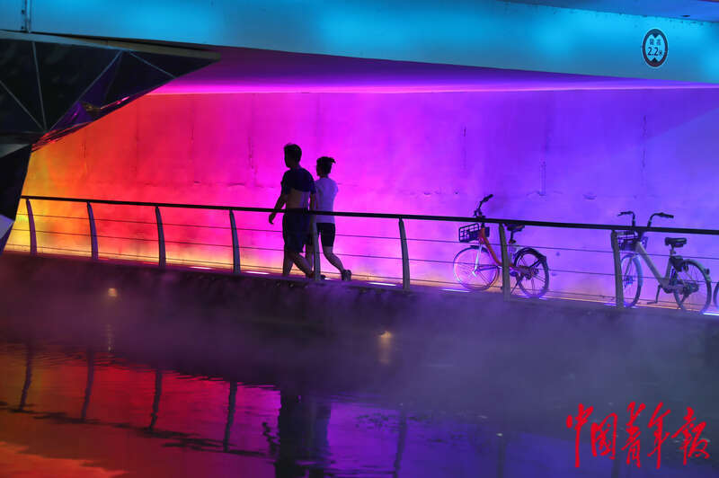 8月15日,北京市朝阳区亮马河边,市民在亮起彩色灯光的岸边散步。中青报·中青网记者 陈剑/摄