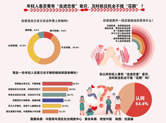 调查中,64.4%的受访青年认为年轻人要有“走进恋爱”的意识,及时抓住机会、不错“花期”。