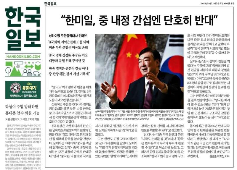 8月18日,《韩国日报》《韩国时报》刊登对邢海明大使的联合专访。邢海明大使在采访中回顾中韩建交31周年来的发展成就,展望两国关系未来发展方向,并就中韩经贸合作、中国经济形势、韩美日领导人会谈、中国公民赴韩团队游等问题回答记者提问。采访全文如下: