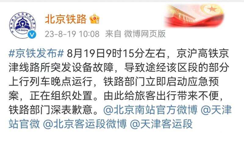 北京铁路发布消息,8月19日9时15分左右,京沪高铁京津线路所突发设备故障,导致途经该区段的部分上行列车晚点运行,铁路部门立即启动应急预案,正在组织处置。由此给旅客出行带来不便,铁路部门深表歉意。