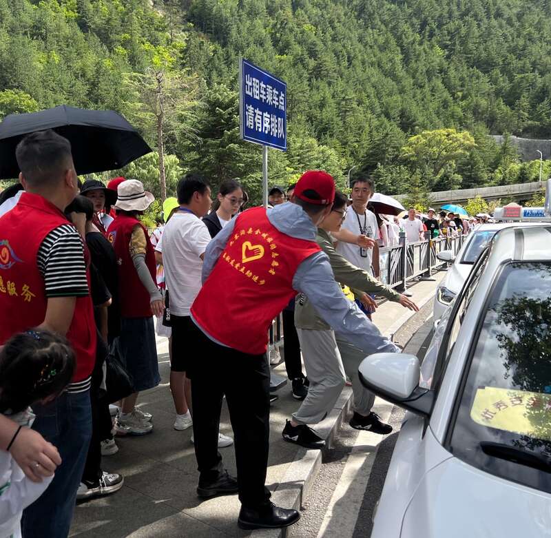 下午阳光强烈,是游客出沟的高峰期,也是第二批志愿者到岗的时间。志愿者下午的工作压力更大,尤其是沟口乘坐出租车和摆渡车点位,在4个小时的“执勤”中,志愿者们手持指示牌,为游客指引乘车方向、点位,还要耐心劝导插队游客,提醒大家注意乘车安全。