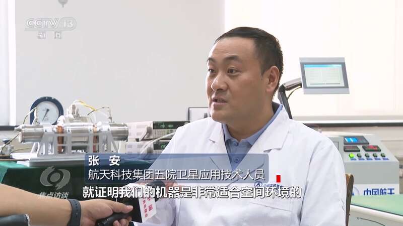 航天科技集团五院卫星应用技术人员张安:“最终效率达到了24.72%,整机运行输出参数优于地面,证明机器非常适合空间环境,也就非常适用于未来空间任务的需求。”