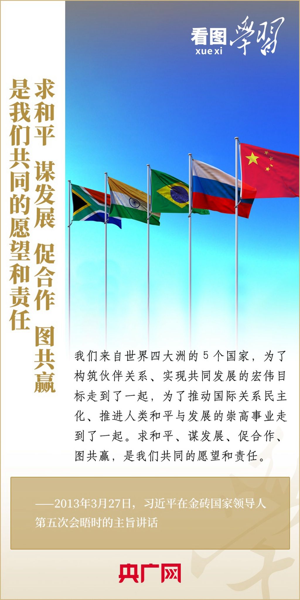 应南非共和国总统拉马福萨邀请,国家主席习近平将于8月21日至24日出席在南非约翰内斯堡举行的金砖国家领导人第十五次会晤并对南非进行国事访问,并将同拉马福萨共同主持中非领导人对话会。2013年以来,习近平主席多次出席或主持金砖国家领导人会晤,并发表一系列重要讲话,强调金砖国家是守望相助的大家庭、合作共赢的好伙伴。一起来学习!