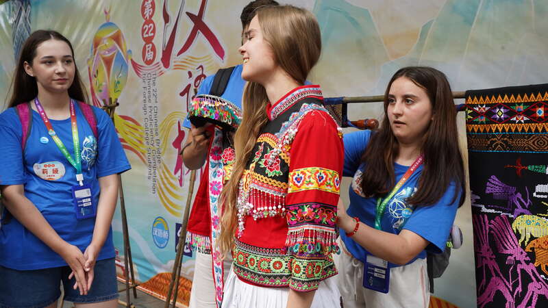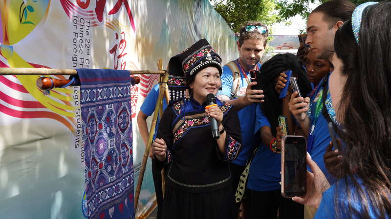 8月21日,广西百色市田阳区田州古镇,第22届“汉语桥”世界大学生中文比赛启动仪式上,壮族织锦技艺国家级代表性传承人李村灵(左一)为参赛选手讲解壮锦纹样。易经云/摄