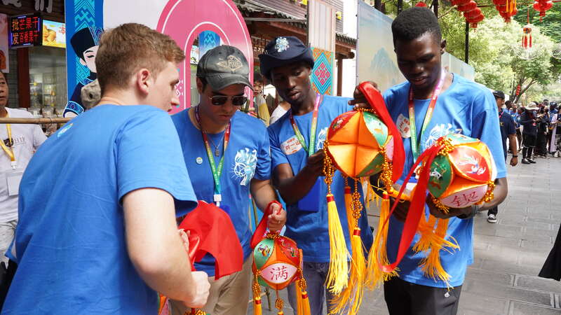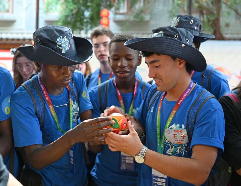 8月21日上午,广西百色市田阳区田州古镇,第22届“汉语桥”世界大学生中文比赛启动仪式上,来自不同国家的参赛选手好奇地观察壮族绣球。周福宁/摄