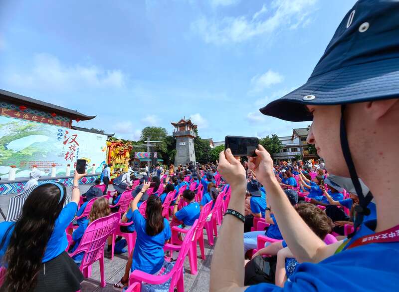8月21日,广西百色市田阳区田州古镇,第22届“汉语桥”世界大学生中文比赛启动仪式现场,参赛选手拍照记录。周福宁/摄