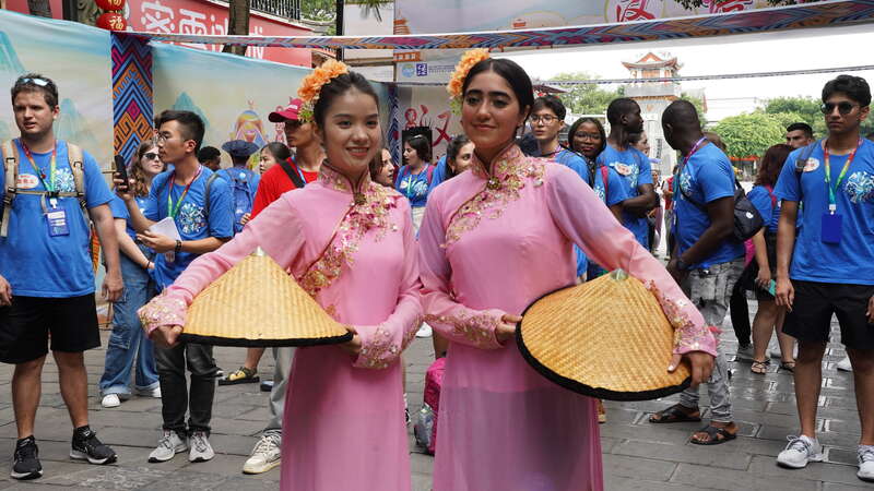 8月21日,广西百色市田阳区田州古镇,第22届“汉语桥”世界大学生中文比赛启动仪式后的民俗文化大师体验课上,一名埃及姑娘(前右)穿上京族服装与模特合影。 易经云/摄