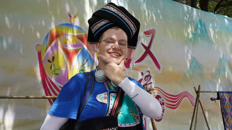 8月21日,广西百色市田阳区田州古镇,第22届“汉语桥”世界大学生中文比赛启动仪式后的民俗文化大师体验课上,一名参赛选手体验壮族服饰。 易经云/摄