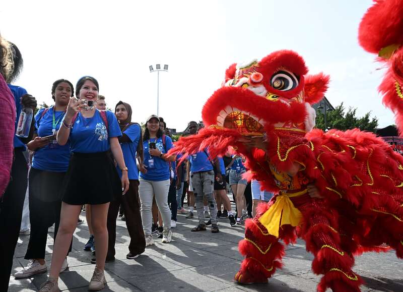 8月21日,广西百色市田阳区田州古镇,第22届“汉语桥”世界大学生中文比赛启动仪式上,舞狮表演吸引众多参赛选手驻足观看。周福宁/摄