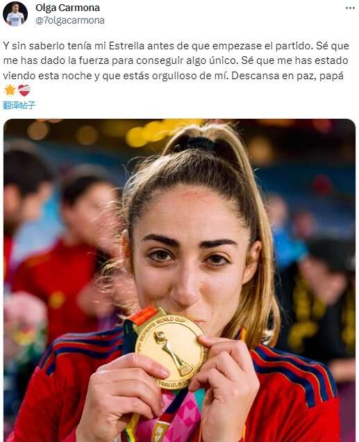 美联社称,终场哨响后,奥尔加和西班牙球员们一起在场上庆祝,在颁发奖杯时,她似乎也正常参与。奥尔加晚些时候在社交平台X上说,“冥冥中,我在比赛开始前就拥有了自己的那颗星。我知道是你赋予了我力量,让我取得了独一无二的成就。我知道你今晚在注视着我,你为我感到骄傲。安息吧,父亲。”她还附上了一张自己亲吻奖牌的照片。