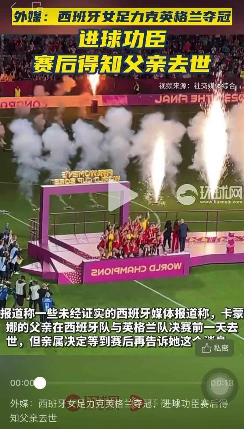 据美联社报道,20日,在澳大利亚悉尼,西班牙队以1比0击败英格兰队,首次夺得女足世界杯冠军,队长奥尔加·卡蒙娜是射入这粒进球的功臣。不过,报道称,西班牙足协晚些时候表示,在决赛后,奥尔加得知了自己父亲去世的噩耗。