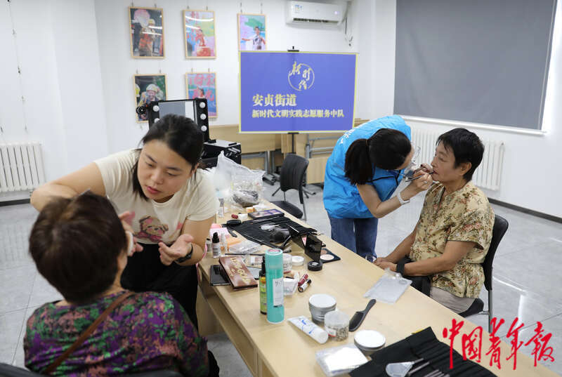 8月21日,北京市朝阳区安贞街道党群服务中心,志愿者为准备拍照的老人们化妆。中青报·中青网记者 陈剑/摄