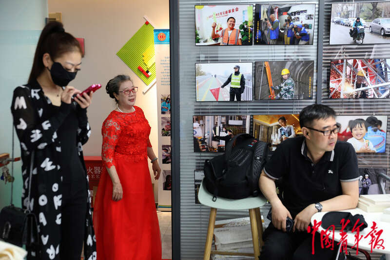 8月21日,北京市朝阳区安贞街道党群服务中心,67岁的刘伟(左二)换上一套中式的红色礼服,在摄影棚外等候拍照。中青报·中青网记者 陈剑/摄