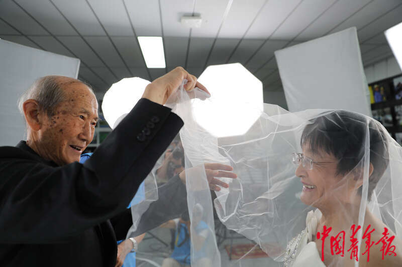 8月21日,北京市朝阳区安贞街道党群服务中心,陈宝琴(右)、崔彦校夫妇俩在补拍婚纱照。陈宝琴今年81岁,崔彦校今年85岁,他们结婚50多年了。中青报·中青网记者 陈剑/摄
