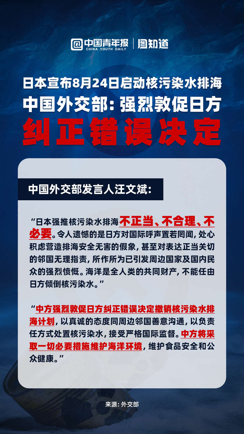 8月22日,外交部发言人汪文斌主持例行记者会。就日本核污染水排海相关问题,汪文斌表示,日本政府不顾国际社会严重关切和坚决反对,执意宣布将于8月24日启动福岛核污染水排海,公然向全世界转嫁核污染风险,将一己私利凌驾于全人类长远福祉之上,此举极端自私极不负责任。中方严重关切并强烈反对已向日方提出严正交涉。