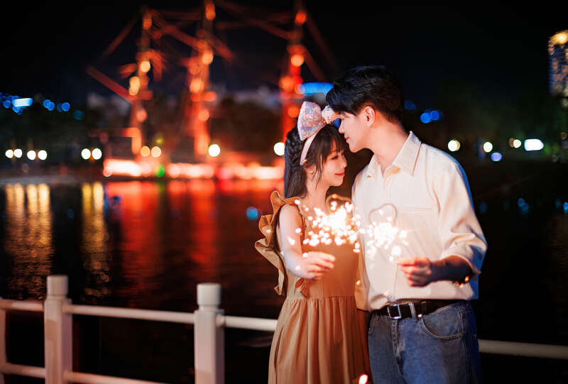 情侣在珠海长隆海洋王国燃放烟花。邓泳怡/摄