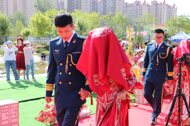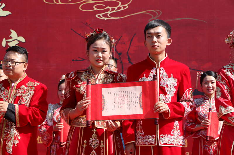 活动在浪漫喜庆的氛围中拉开序幕,20对新人在主持人的引导下,牵手走到舞台中央,享受一场仪式简约、庄重神圣的集体婚礼,感悟铭记婚姻家庭蕴含的责任担当。在大家的见证和祝福下,新人们迈火盆、拜天地、挑盖头、签婚约书,交换葫芦、敬酒,并将两瓣葫芦合二为一,在场亲友们祝福新人婚后福禄双全。期间,嘉宾宣读了证婚词,并向新人颁发纪念品。