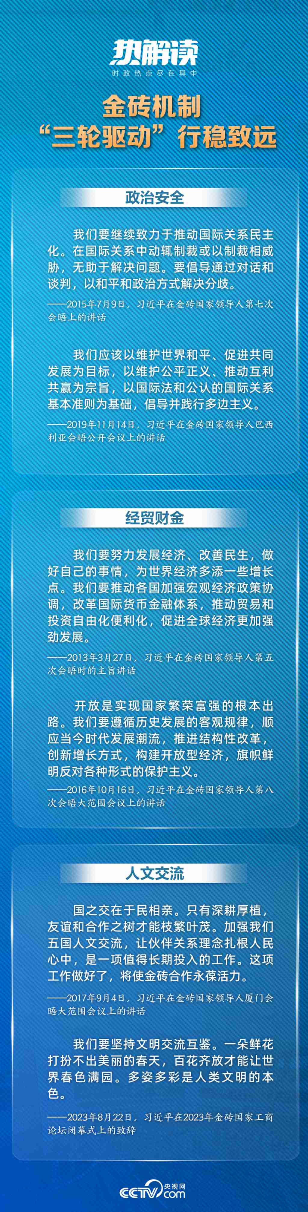 从字母组合的符号象征到一块实打实的“金砖”,回顾金砖合作机制走过的历程,习近平主席倡导的“三轮驱动”合作架构为金砖国家合作发展提供了可行有效的抓手。