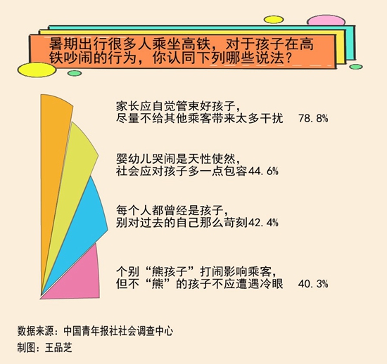 暑期带孩子出游,孩童高铁吵闹引发纷争的事件时有发生。近日,中国青年报社社会调查中心联合问卷网(wenjuan.com),对1501名受访者进行的一项调查显示,对于孩子在高铁吵闹的行为,78.8%的受访者认为家长应自觉管束好孩子,44.6%的受访者认为婴幼儿哭闹是天性使然,社会应对孩子多一点包容。