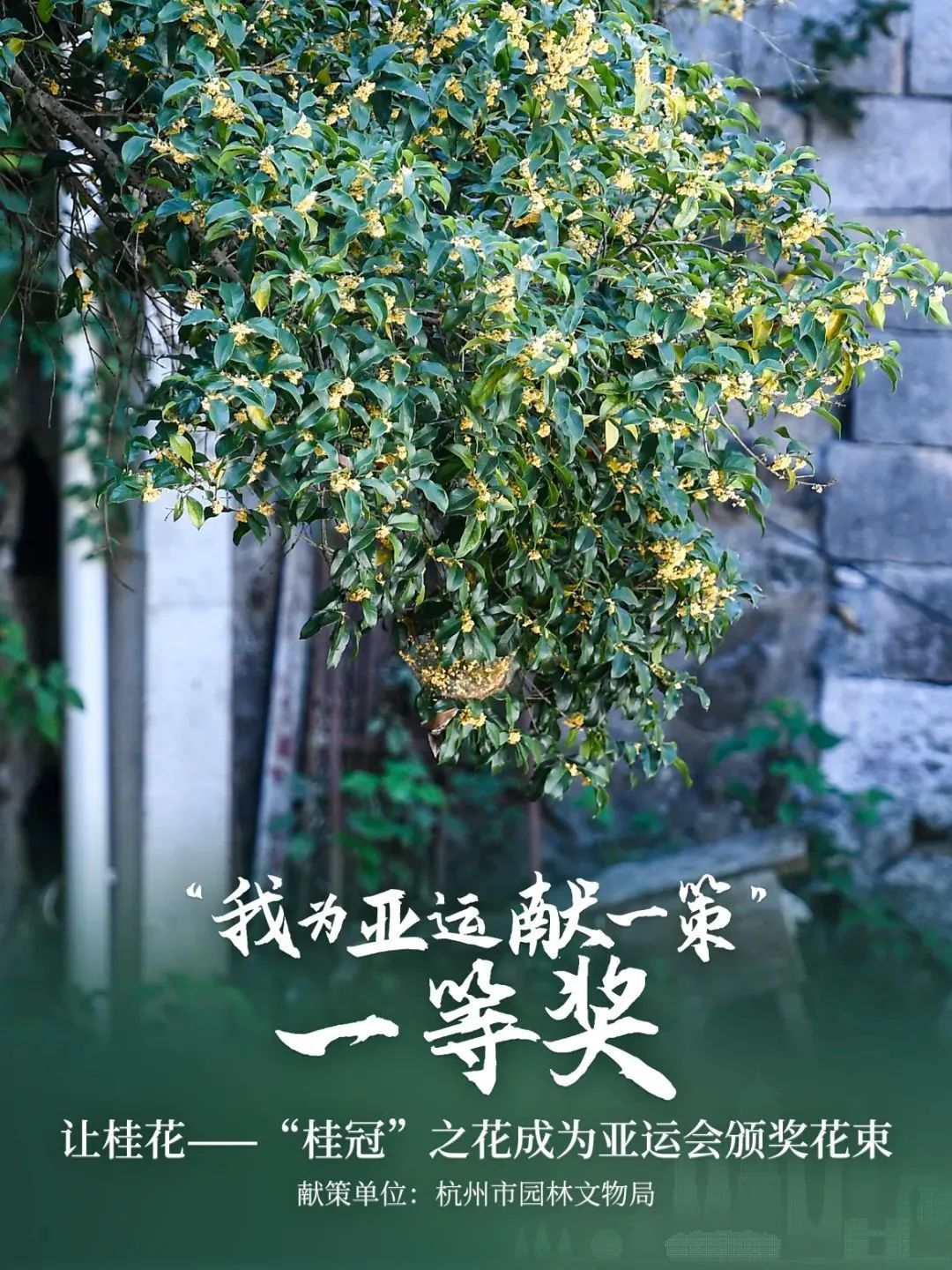 今年3月7日,杭州市“我为亚运献一策”征集活动揭晓,由杭州市园林文物局提出的建议“让桂花——‘桂冠’之花成为亚运会颁奖花束”获得一等奖(点击了解)。