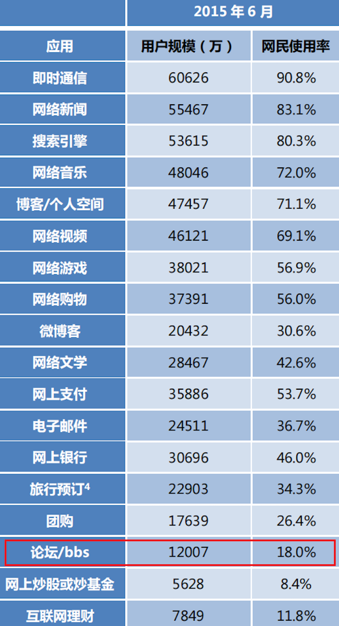 另一方面,移动互联网时代到来,互联网继续下沉,大量新用户涌入,各种平台型社交软件崛起,互联网的权力中心和话题中心早已发生了转移。2015年,登陆新三板的天涯已日薄西山、艰难挣扎,陷入很严重的亏损状态。而根据第36次中国互联网络发展状况统计报告(2015),截至2015年6月,我国网民规模达6.68亿,即时通信、博客、微博等如火如荼,论坛/BBS在网络应用使用率排名中已经滑落到第16位,用户规模为1.2亿,网民使用率仅剩18%,远低于博客的71.1%和微博客的30.6%。