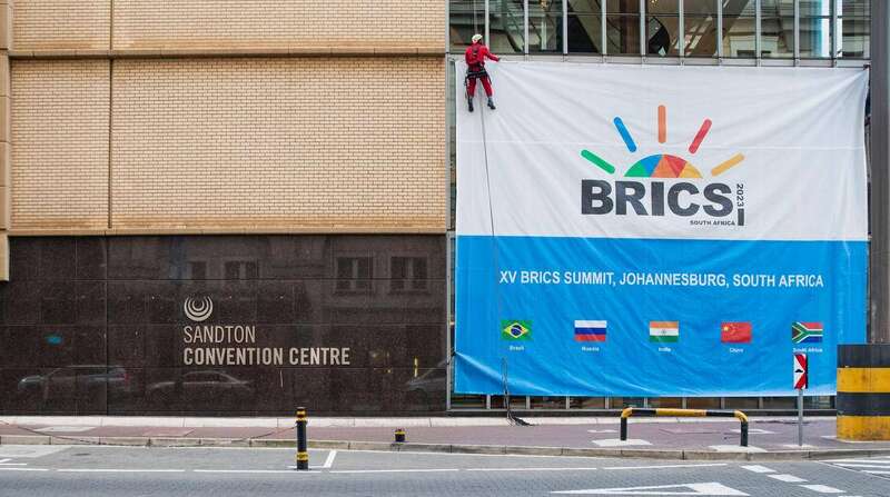 2023年8月17日,在南非约翰内斯堡,工人在桑顿会展中心外布置金砖峰会横幅。