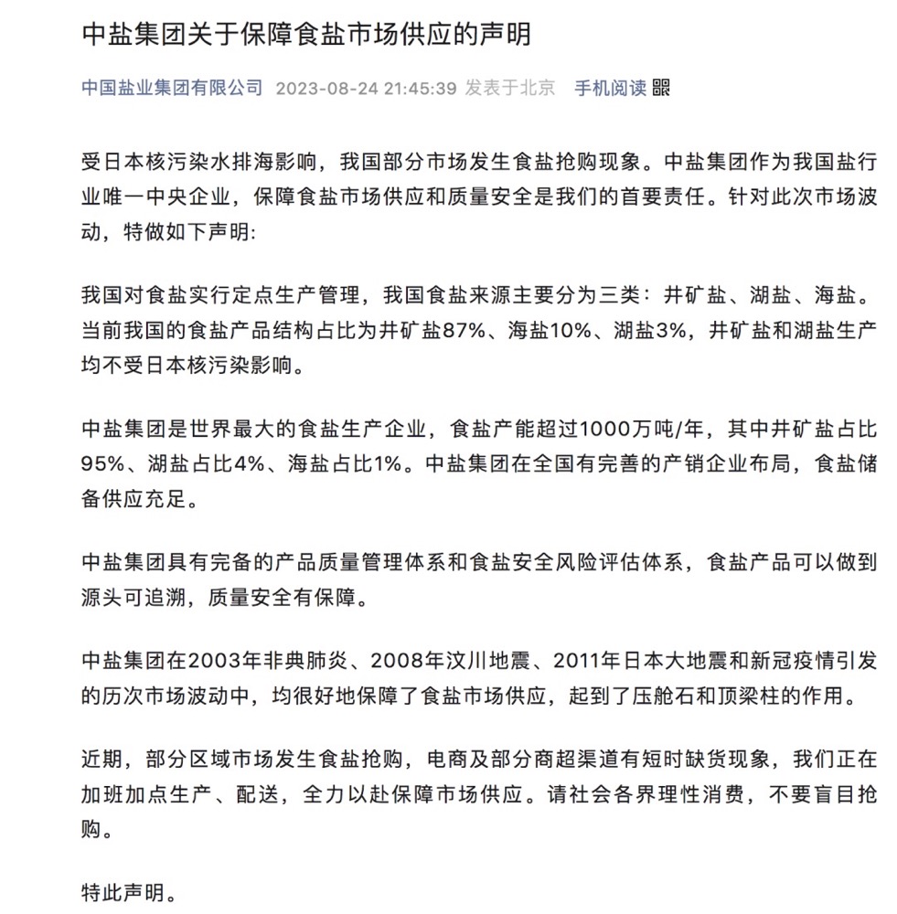 山东省盐业协会发文表示,山东省所产食盐以井矿盐和地下卤水制盐为主,不受日本核污染水排海影响。