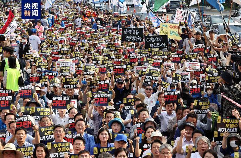 当地时间8月26日下午,韩国环境市民团体“阻止日本核污染水排放入海共同行动”、共同民主党、进步党、正义党等政治界人士以及普通民众共同聚集在位于首尔市中心的世宗大路,举行“反对福岛污水排放泛国民大会”。据主办方推算,参加集会的有约5万人。