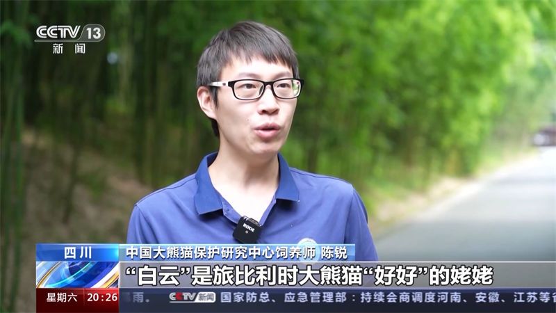 中国大熊猫保护研究中心饲养师陈锐:“白云”32岁了,相当于人类约100岁,“希梦”也30岁了,都很健康。它俩还有个特殊身份,“白云”是旅比利时大熊猫“好好”的姥姥,“希梦”是旅比利时大熊猫“星徽”的姥爷。