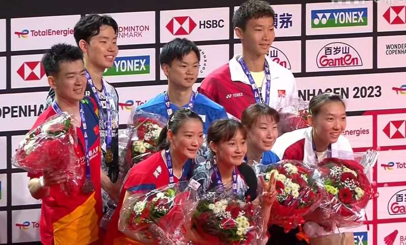 获得本次羽毛球世锦赛混双金、银、铜牌的四对选手合影。直播视频截图