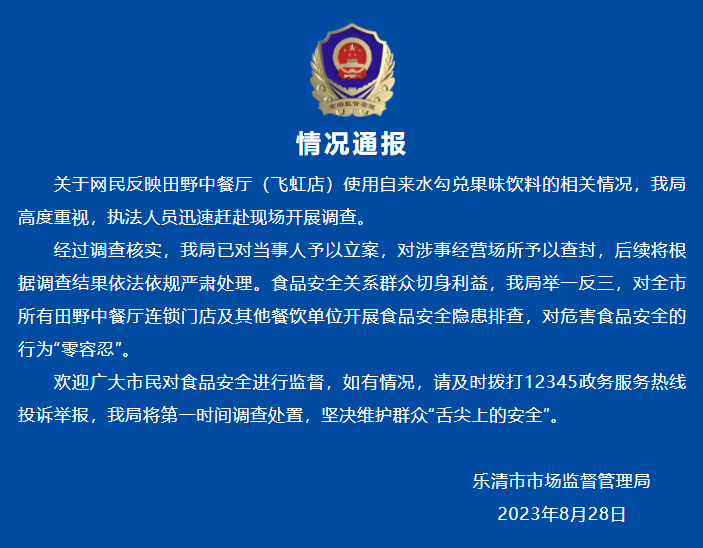 经过调查核实,我局已对当事人予以立案,对涉事经营场所予以查封,后续将根据调查结果依法依规严肃处理。食品安全关系群众切身利益,我局举一反三,对全市所有田野中餐厅连锁门店及其他餐饮单位开展食品安全隐患排查,对危害食品安全的行为“零容忍”。