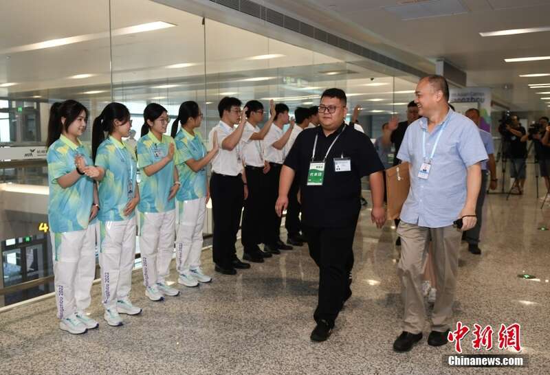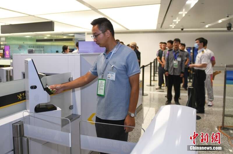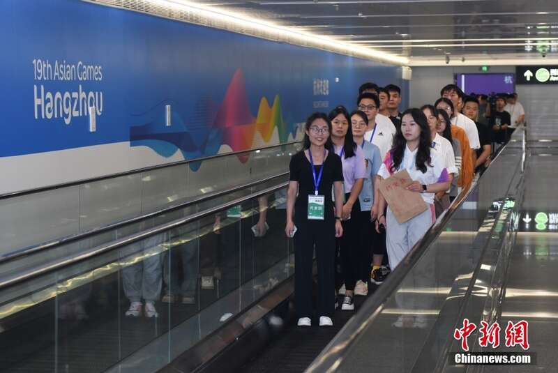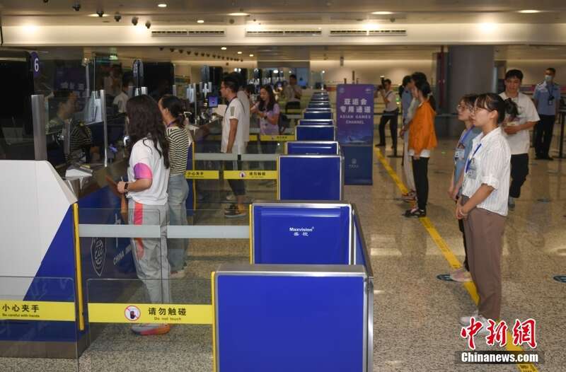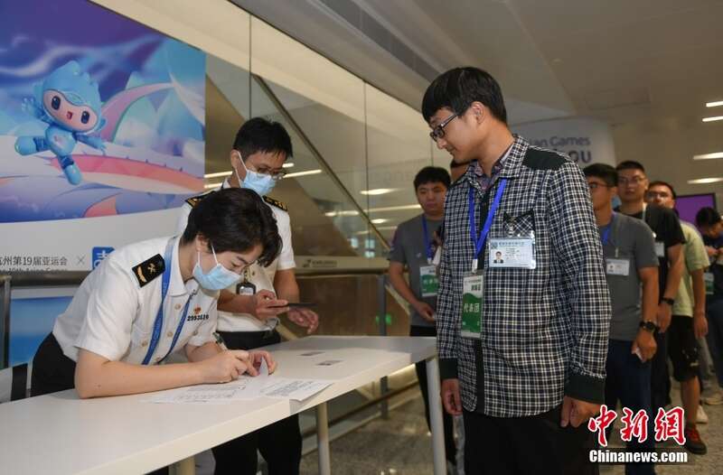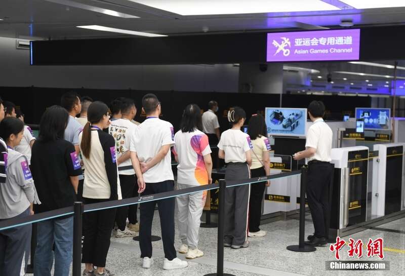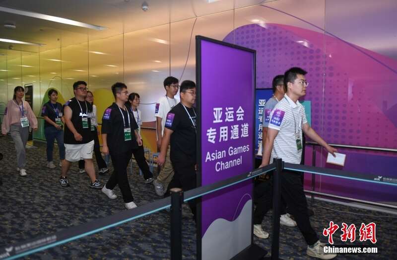 8月29日,模拟境外代表团的人员进入杭州机场。当日,浙江杭州机场开展杭州亚运会“赛时一天”集中抵离压力测试,三支模拟的境外代表团共300余人在1小时内通过机场“亚运会专用通道”,完成卫生检疫、边防检查、海关查验、注册卡激活、行李提取等入境流程,从机场进入城市。
