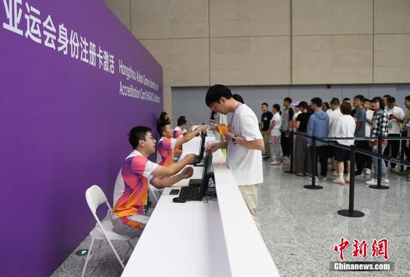 参与演练的人员在杭州机场模拟激活杭州亚运会身份注册卡。