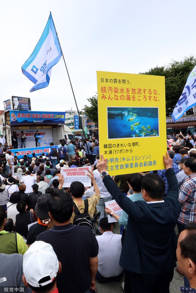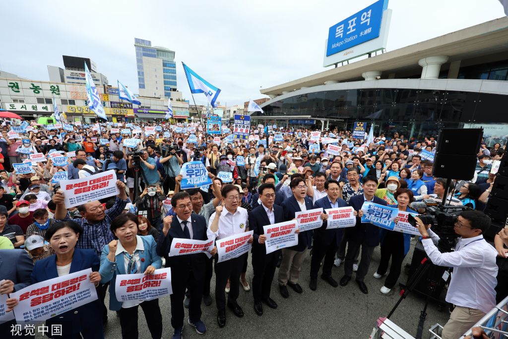 当地时间2023年8月30日,韩国木浦,韩国共同民主党党首李在明和韩国共同民主党院内代表朴光温参加“日本福岛核电站核污染水排海投机谴责大会”,并高喊口号。